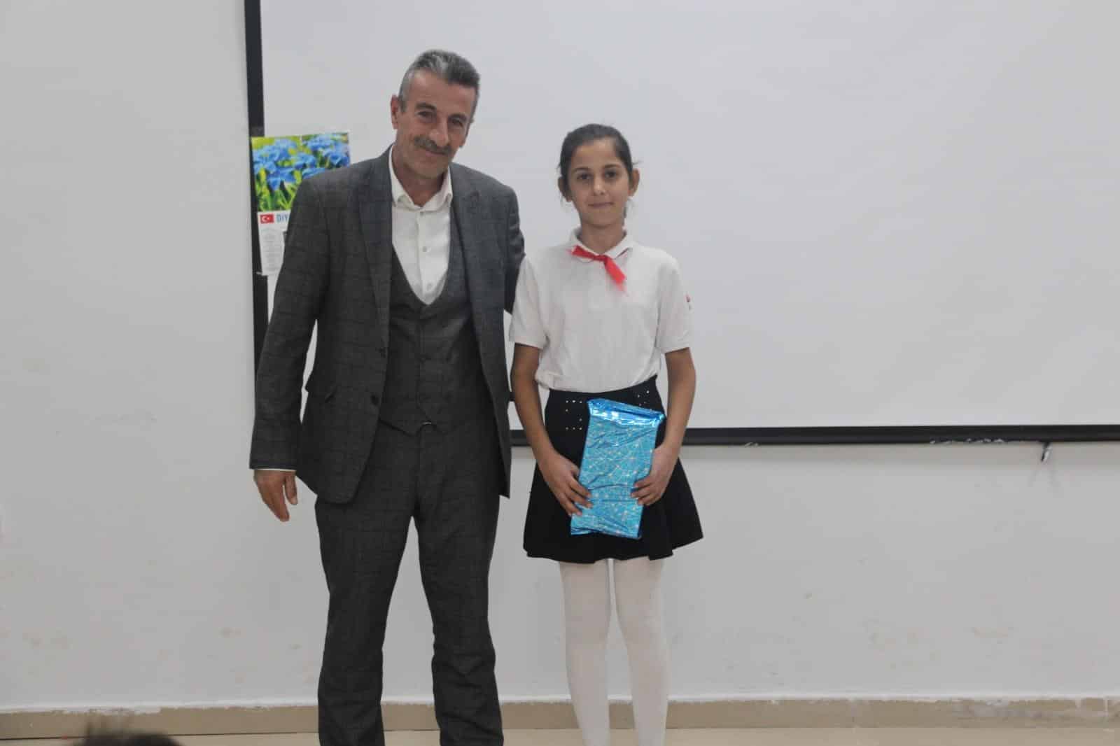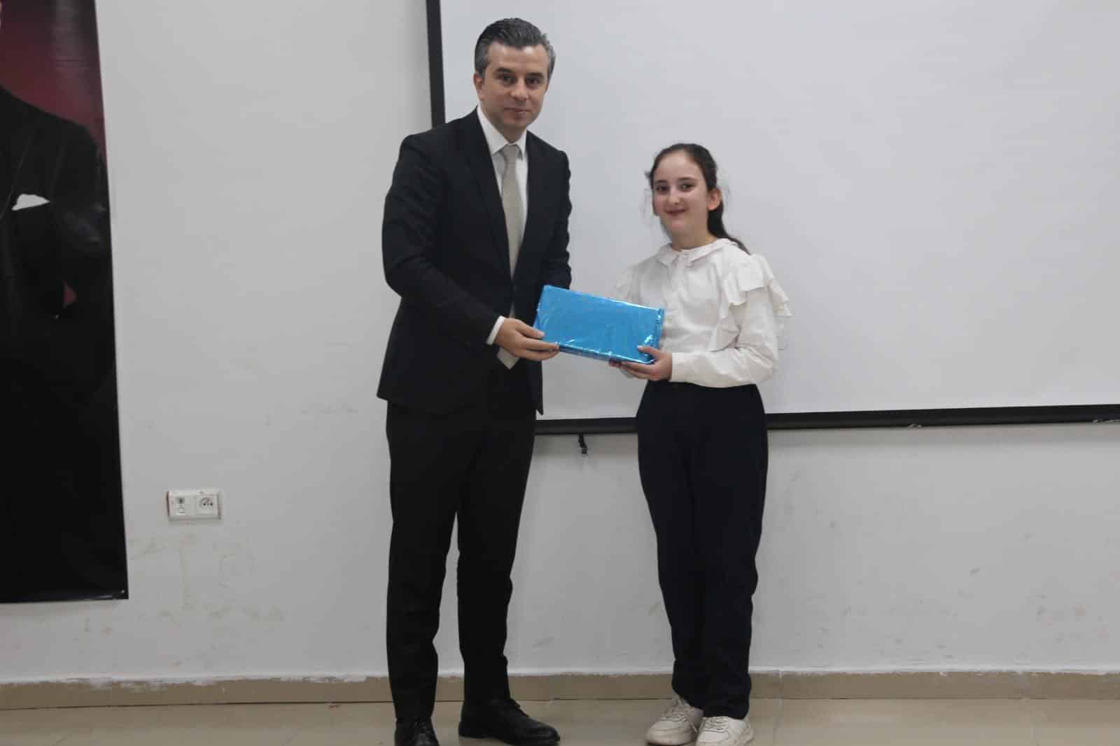 Şiir ve Resim alanlarında başarılı olan öğrencilerimize hediyelerini Sayın Kaymakamız Tanju ÇANAKCIOĞLU ve Belediye Başkan Vekili Musa ADİRT takdim etti.